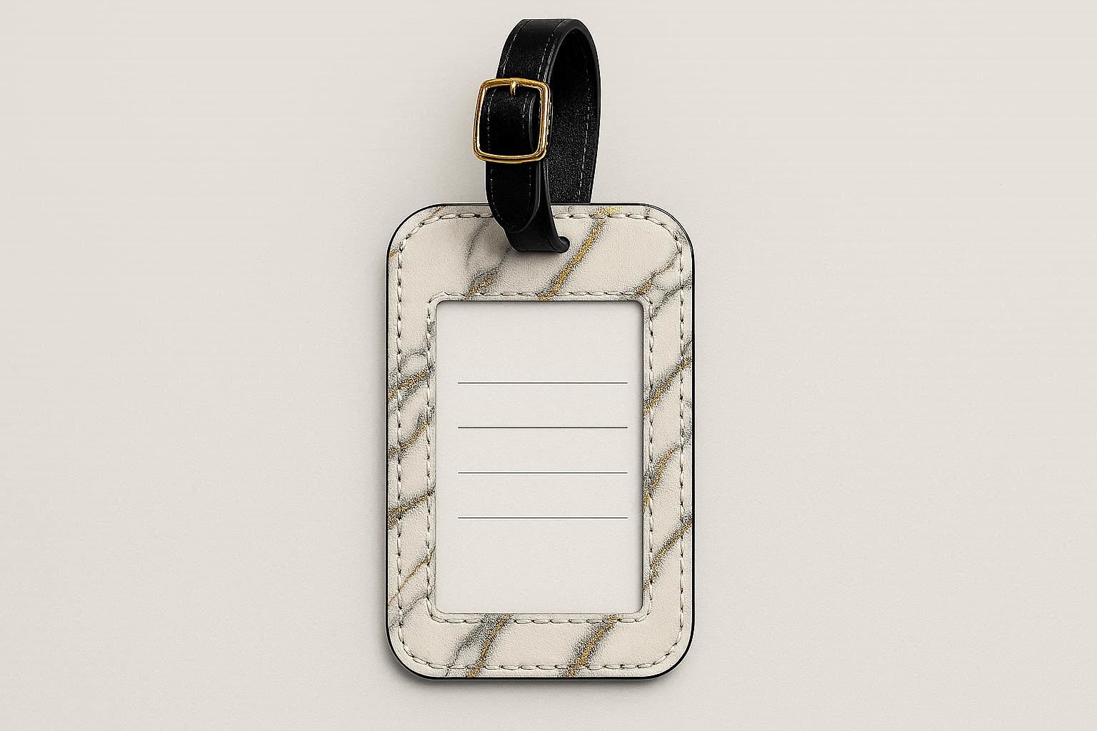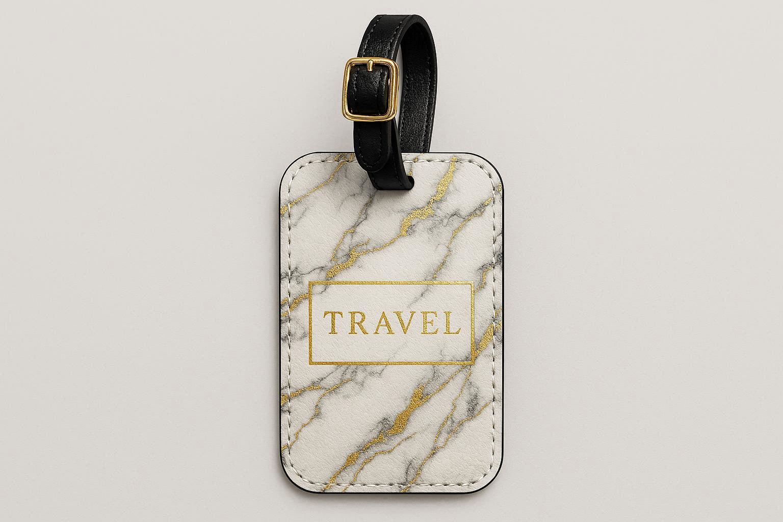 A matching gold-toned metal buckle and strap provide secure attachment. The waterproof and scratch-resistant surface ensures it maintains its sophisticated look throughout your journeys. It is the perfect accessory to elevate the style of your carry-on or suitcase, blending fashion with function.